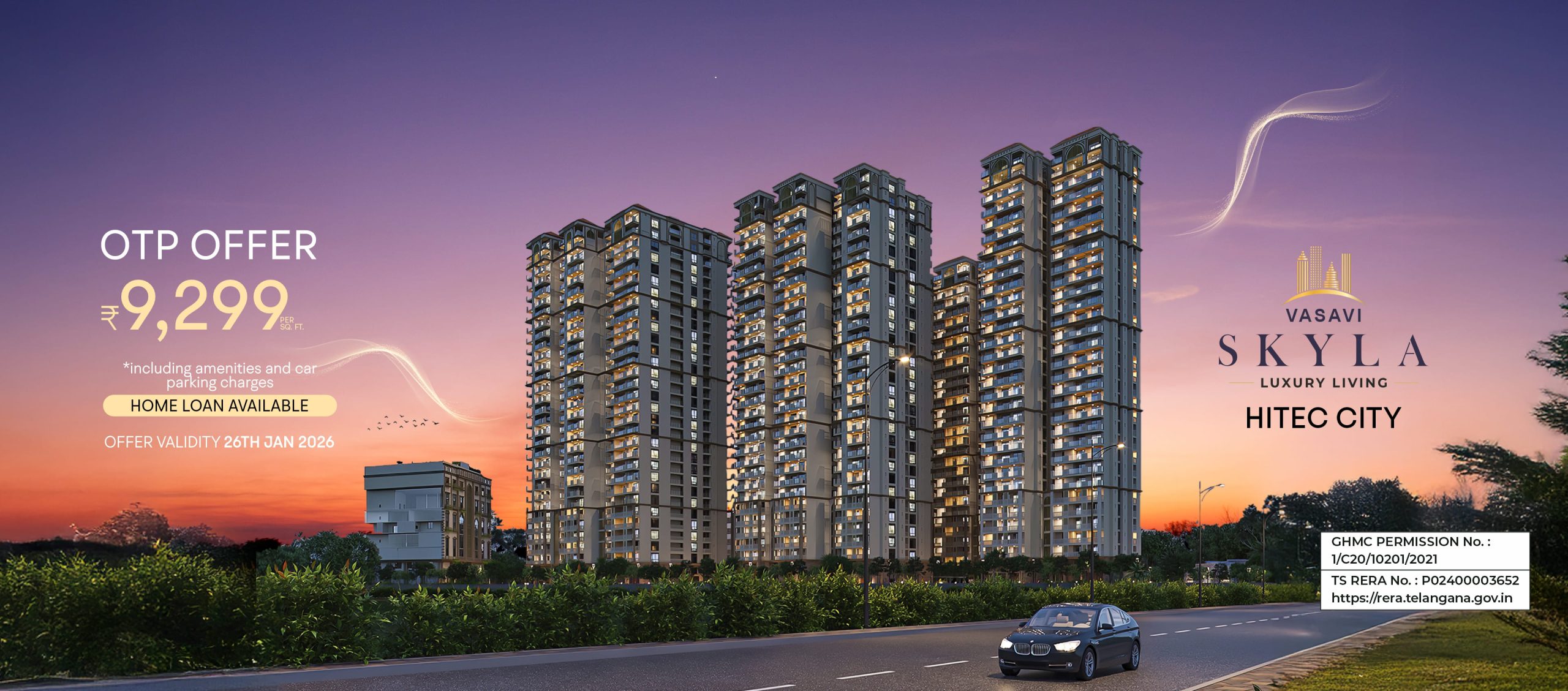 The site address of Vasavi Skyla is Vasavi Skyla, Rd Number 1, Hanuman Nagar, Shilpa Hills, Kondapur, Telangana – 500084.
